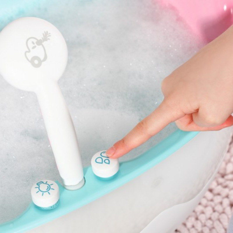 Ванночка всередині блакитного кольору всередині та білого з хвилястим малюнком ззовні. Якщо натиснути на кнопку поруч з душем, зовнішня сторона ванночки сяє різними кольорами. Натисніть кнопку біля душа, щоб активувати його. Якщо ванна порожня, ви можете почути плескіт і звуки води.