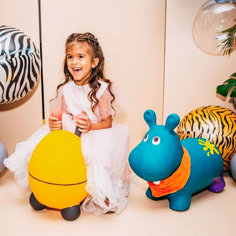 До комплекту входить — 1 надувний стрибун-гіпопотів, насос;