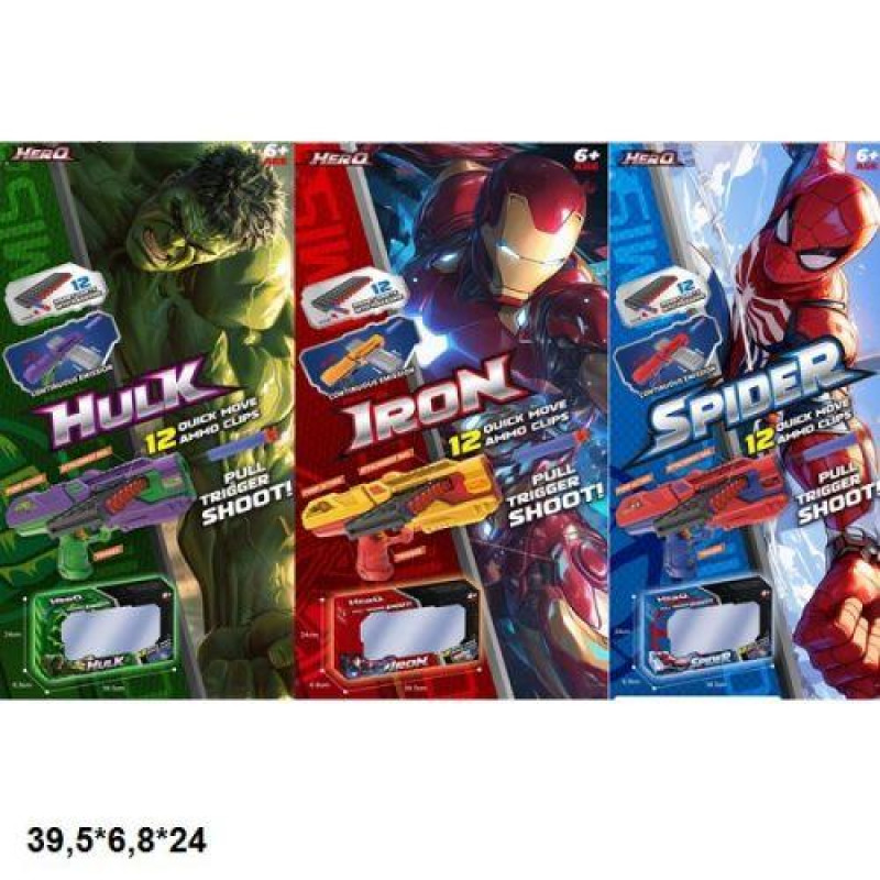 Ігровий набір із бластером, який стріляє поролоновими патронами. Виконаний у супергеройській тематиці, він обов'язково приверне до себе увагу і радуватиме дитину. Для початку стрільби обойму з патронами потрібно встановити так, як це зображено на коробці. Розмір бластера - 28,5х16х4,5 см; довжина патрона з присоскою - 7 см. Виконано все з якісних та безпечних матеріалів та рекомендовано для дітей віком від 6 років.