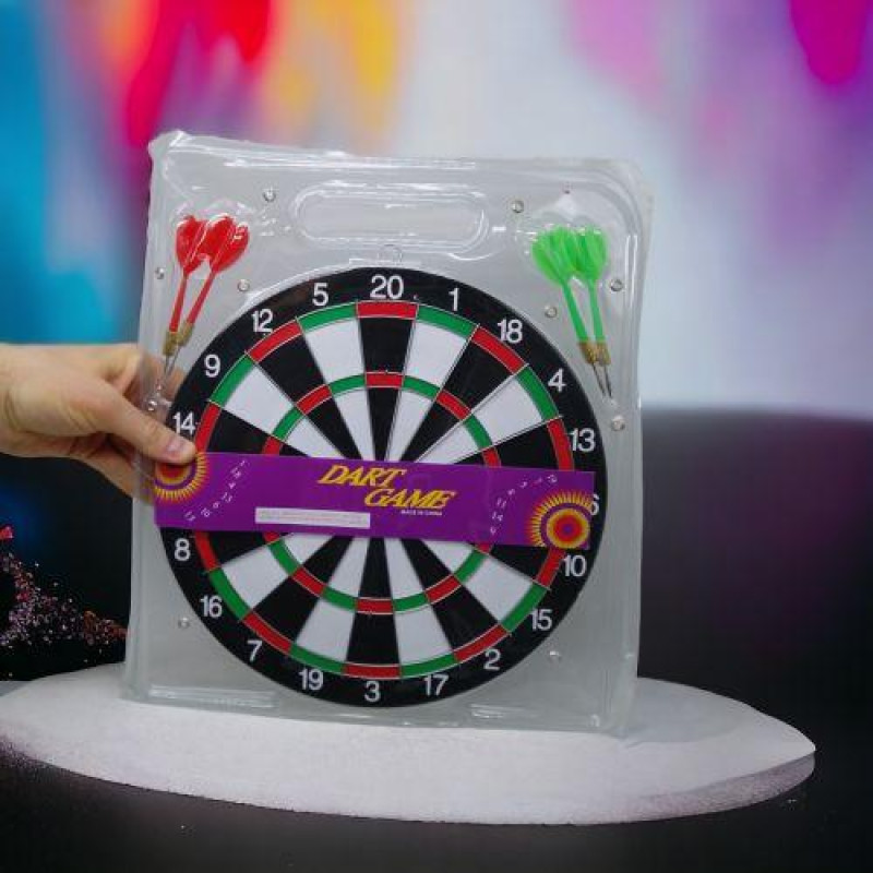 Дартс голчастий. У наборі кругла двостороння ціль із секторною та круговою розміткою. Міцний матеріал забезпечує довговічність і відмінну ігрову поверхню. Класичний дизайн дошки робить її ідеальним доповненням будь-якого інтер?єру. 4 дротики в комплекті. Діаметр мішені: 29 см.