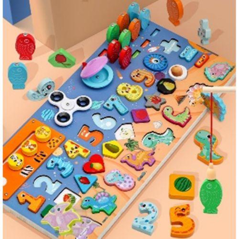 1) 8 вкладишів у формі динозаврів2) Вкладиші з цифрами та математичними знаками3) Вкладиші геометричних фігур з назвами фруктів англійською4) Магнітну рибалку з кольоровими рибками5) Пальчиковий лабіринт6) Спіннер7) Кастаньєти