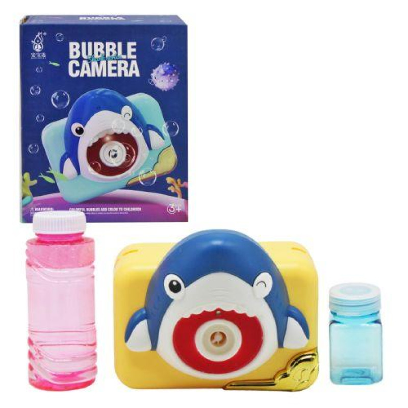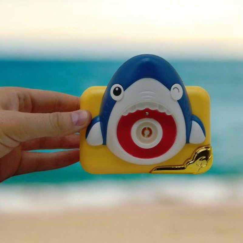 Набір для пускання мильних бульбашок у вигляді камери з головою акули. Потрібно набрати мильний розчин в маленьку баночку і прикрутити її до іграшки. Потім вставить 3 батарейки АА (немає в комплекті). Після включення іграшка почне грати веселу мелодію та пускати велику кількість мильних бульбашок. Зі світловими ефектами.