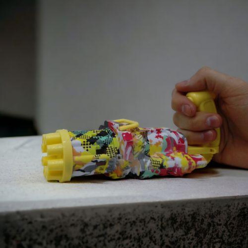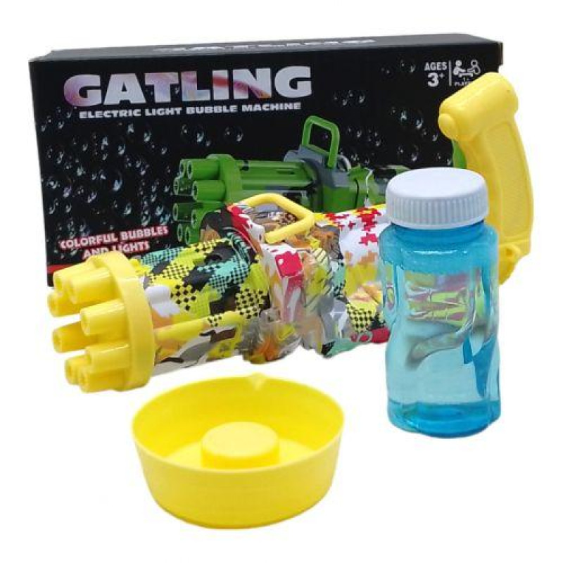 Автомат з мильними бульбашками "Gatling". Має безліч отворів для пускання бульбашок, що дозволяє створювати велику кількість бульбашок одним пострілом. Пістолет ідеально підходить для гри як на вулиці, так і вдома. Працює від 2-х батарейок АА (немає в комплекті). Розмір - 20 х 10 х 7 см.