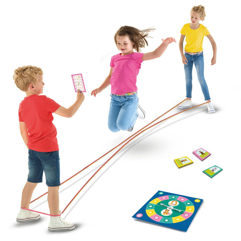 Стрибача команда — це активна гра для дітей, що поєднує рух, веселощі та командну взаємодію. Завдяки блискучій гумці для стрибків, карткам із завданнями та обертовому диску діти зможуть виконувати різноманітні стрибкові трюки, змагатися один з одним і розвивати фізичні навички. Хочете дізнатися додаткові ідеї для гри? Дізнайтеся маму — вона точно пам'ятає!