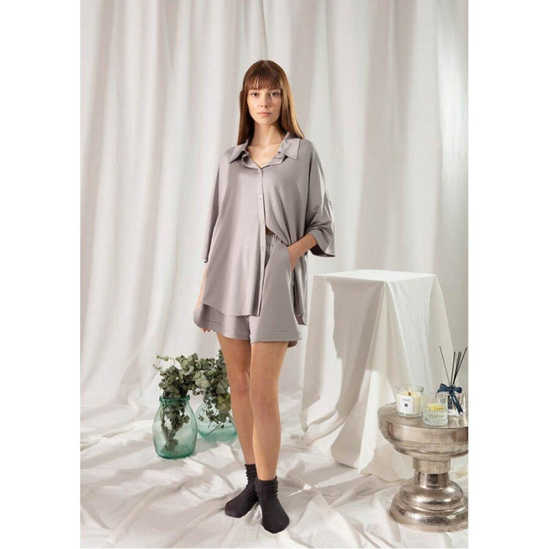 Сорочка на ґудзиках, має комір з одинарним закотом, рукави спущені. Шорти на гумці, широкого крою, мають бічні розрізи.