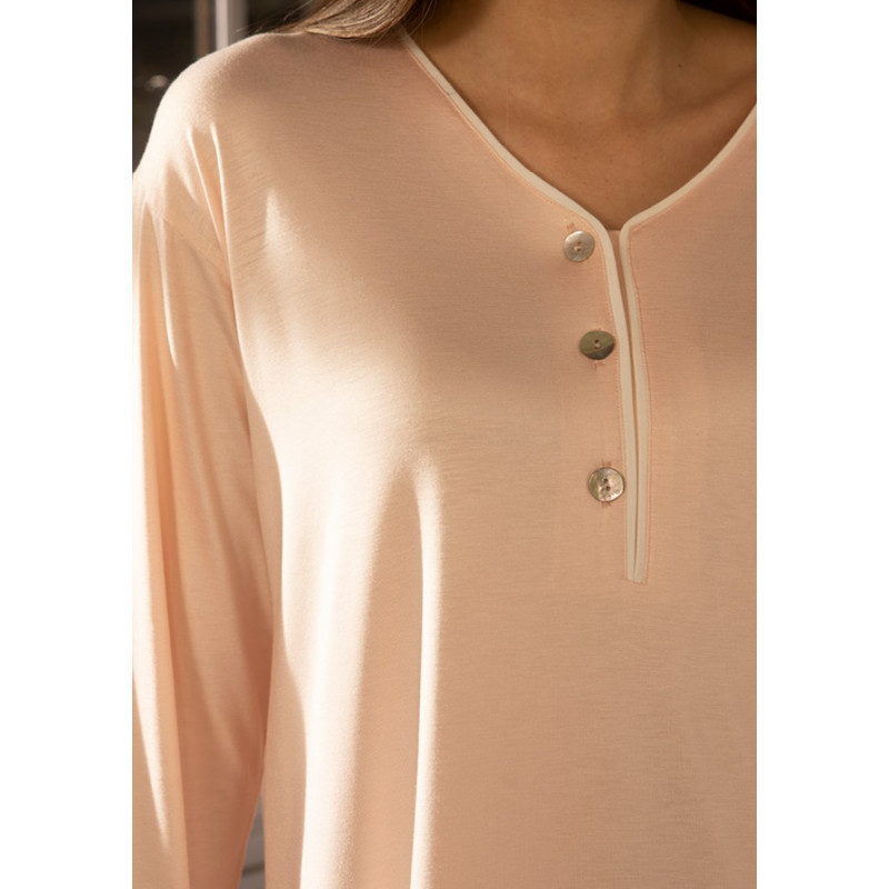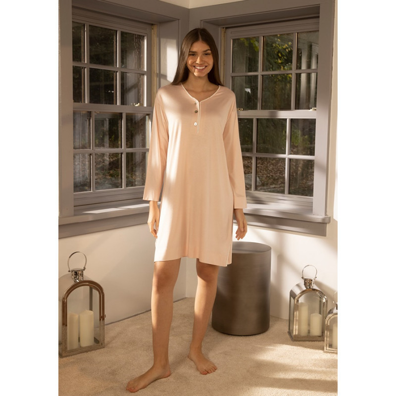 Домашня сукня-сорочка прямого крою, виріб має круглий комір на ґудзиках і нижні бічні розрізи.