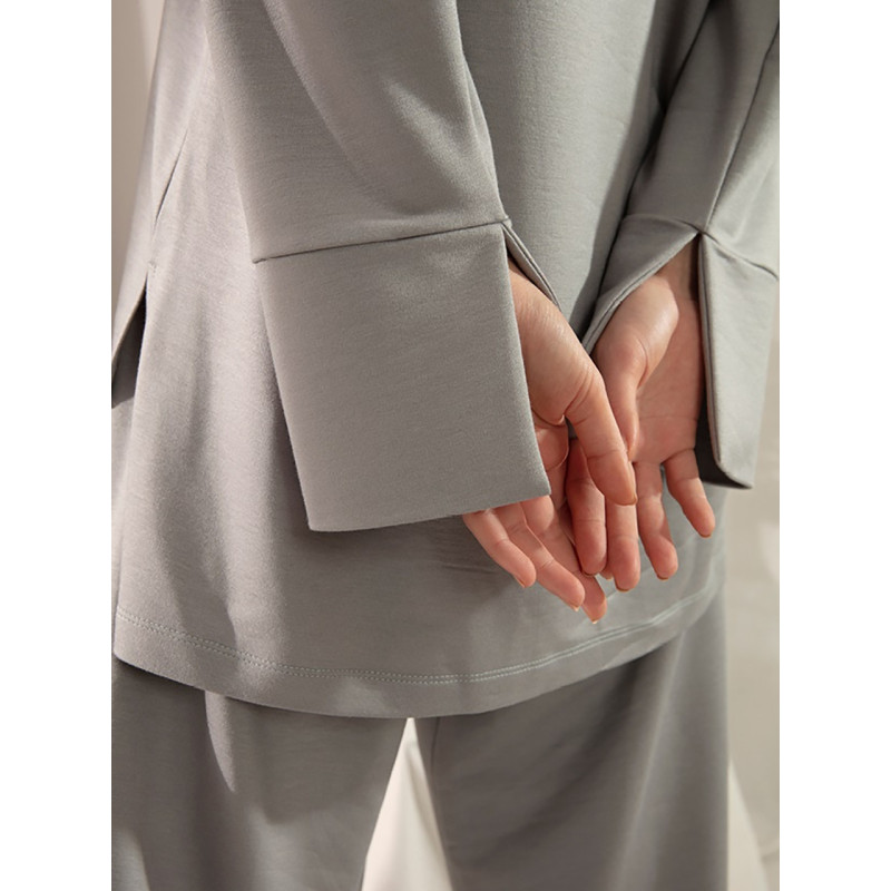 Кофта має круглий широкий виріз, рукави спущені, з розрізами на манжетах, внизу кофти також є невеликі бічні розрізи. Штани на гумці, прямого крою.