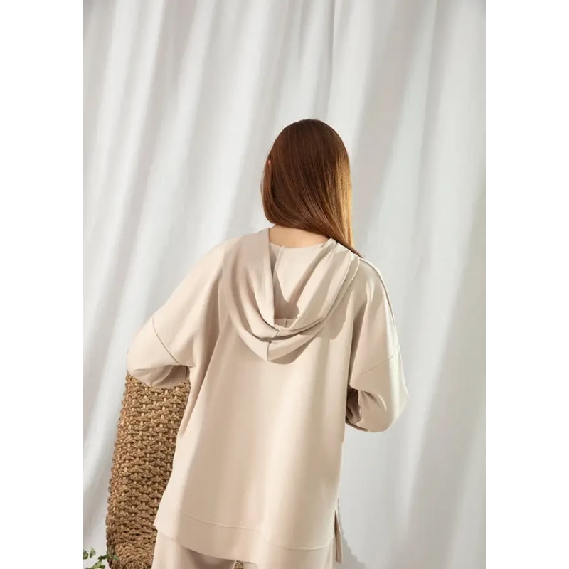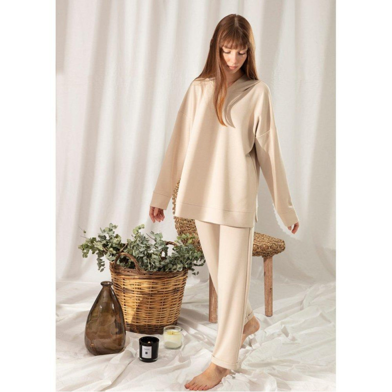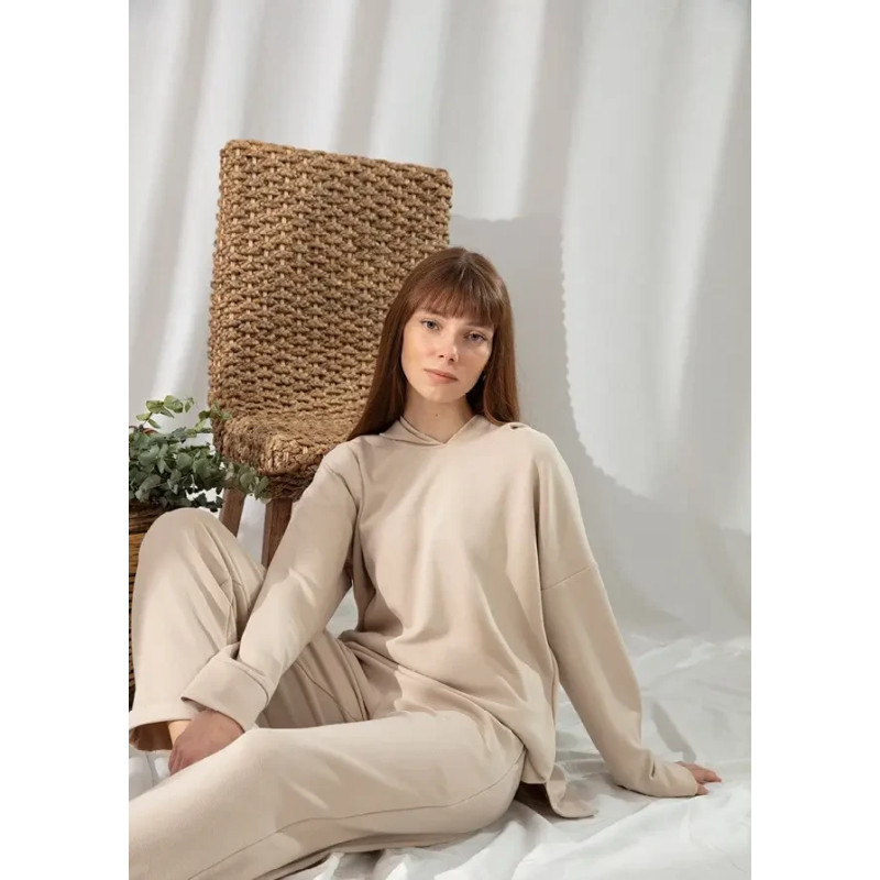 Світшот має капюшон, рукави спущені, з манжетами, внизу світшота є невеликі бічні розрізи. Штани на гумці, прямого крою, з кишенями.