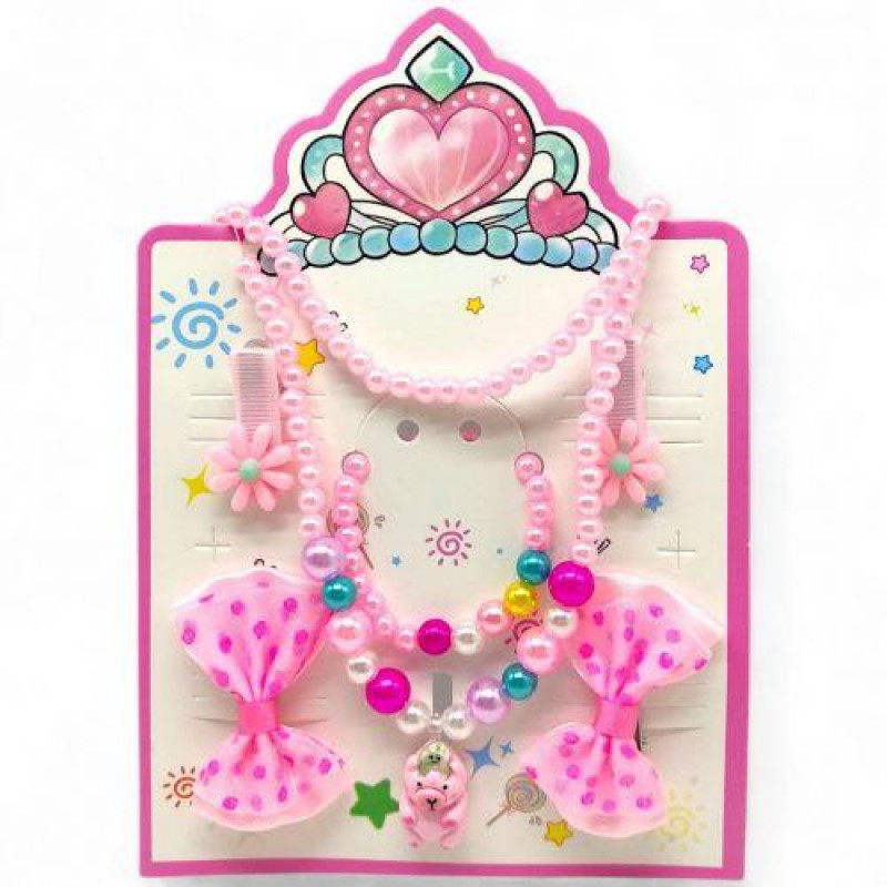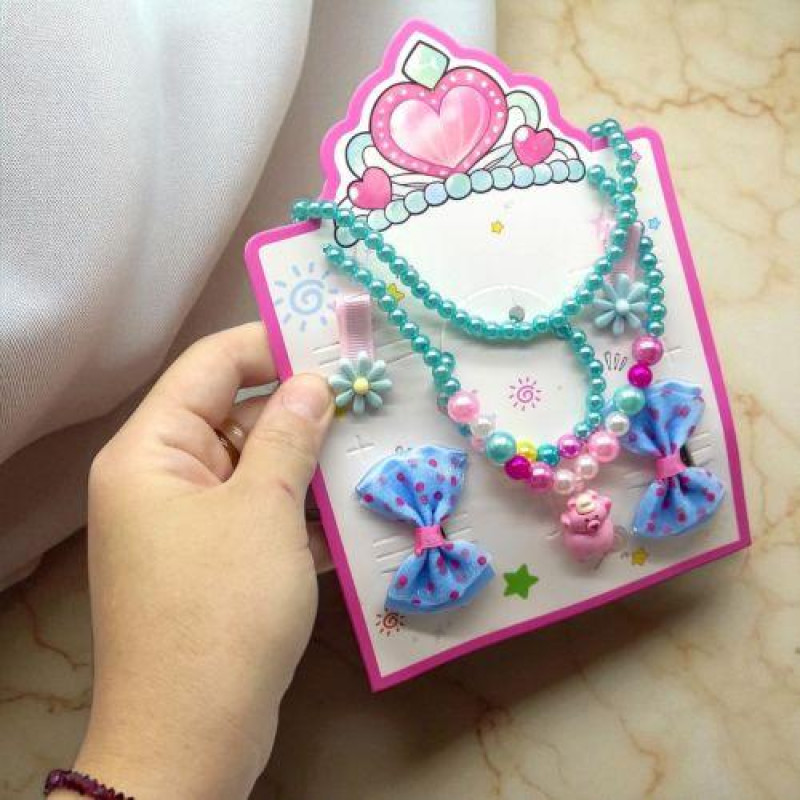 Цей набір прикрас ідеально підійде для будь-якої початківця модниці. У наборі є всі необхідні аксесуари, включаючи дві пари заколочок для волосся - одну у вигляді бантика, а іншу з квіткою - а також браслет і намисто. Намисто прикрашене мініатюрною фігуркою капібари. Довжина намиста - 20 см.