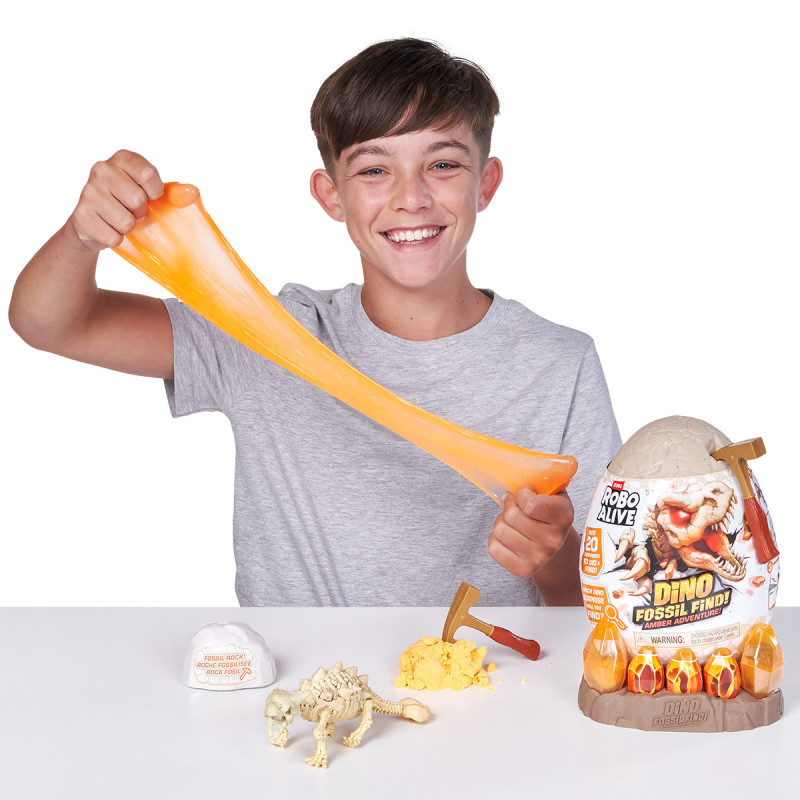 Інтерактивний ігровий набір-сюрприз ROBO ALIVE - ЯНТАРНІ РОЗКОПКИ ДИНОЗАВРА - чудовий подарунок для маленьких шанувальників динозаврів та скам'янілостей! Це величезне яйце, всередині якого знаходяться заховані частини кістяка динозавра. Знайдіть усі елементи – у слаймі, у піску, у камені – і зберіть скелет!