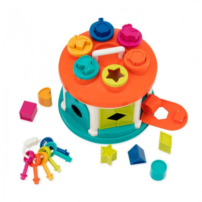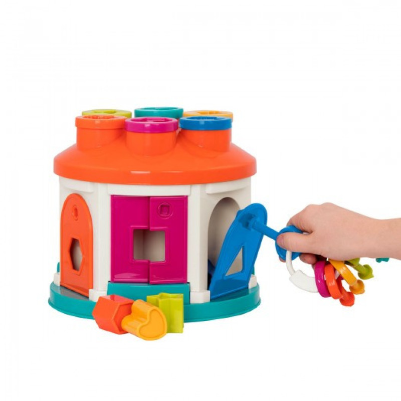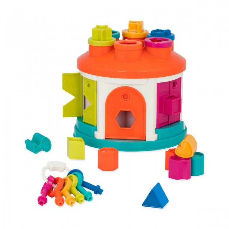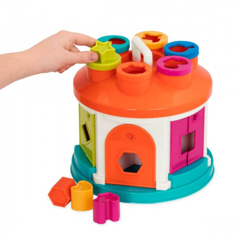 - До набору входять 12 фігурок різних форм і кольорів, які потрібно правильно підібрати до відповідних отворів. Чи знаходяться ці отвори на даху будиночка або в бічних віконцях, доведеться з'ясувати малюкові.