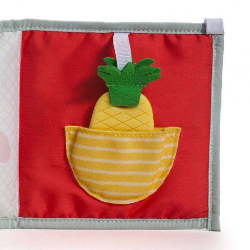 - На другій стороні - веселі барвисті картинки із вставками тканин різних текстур і розвиваючими елементами, деталями, які шарудять, та прорізувачем-ананасом.