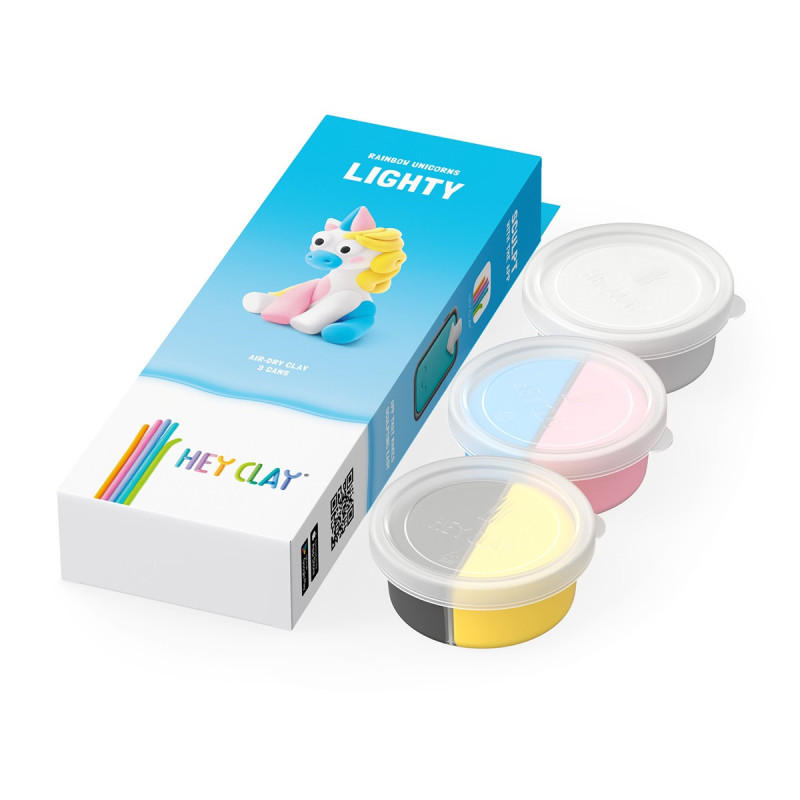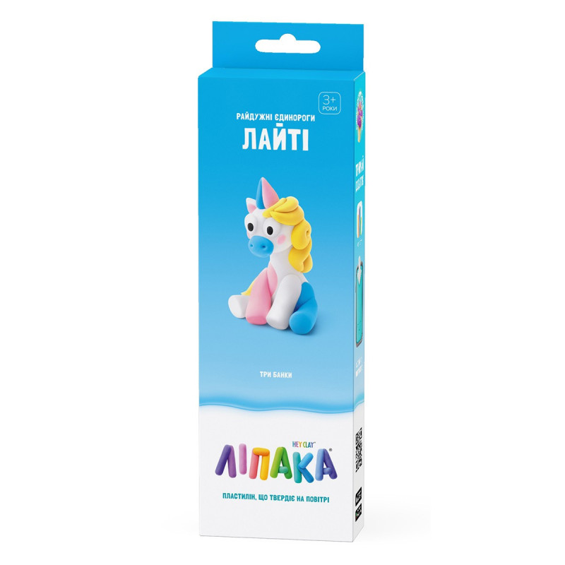Набір пластиліну, що самостійно твердіє, ЛІПАКА - РАЙДУЖНІ ЄДИНОРОГИ: ЛАЙТІ – розважить і малюків і дорослих. За допомогою анімаційних інструкцій в застосунку HEY CLAY, Ви зможете зліпити милу єдиноріжку Лайті. А завдяки компактним розмірам, набір зручно брати з собою. Пластилін твердіє на повітрі протягом 24 годин, після чого можна гратися створеними фігурками.