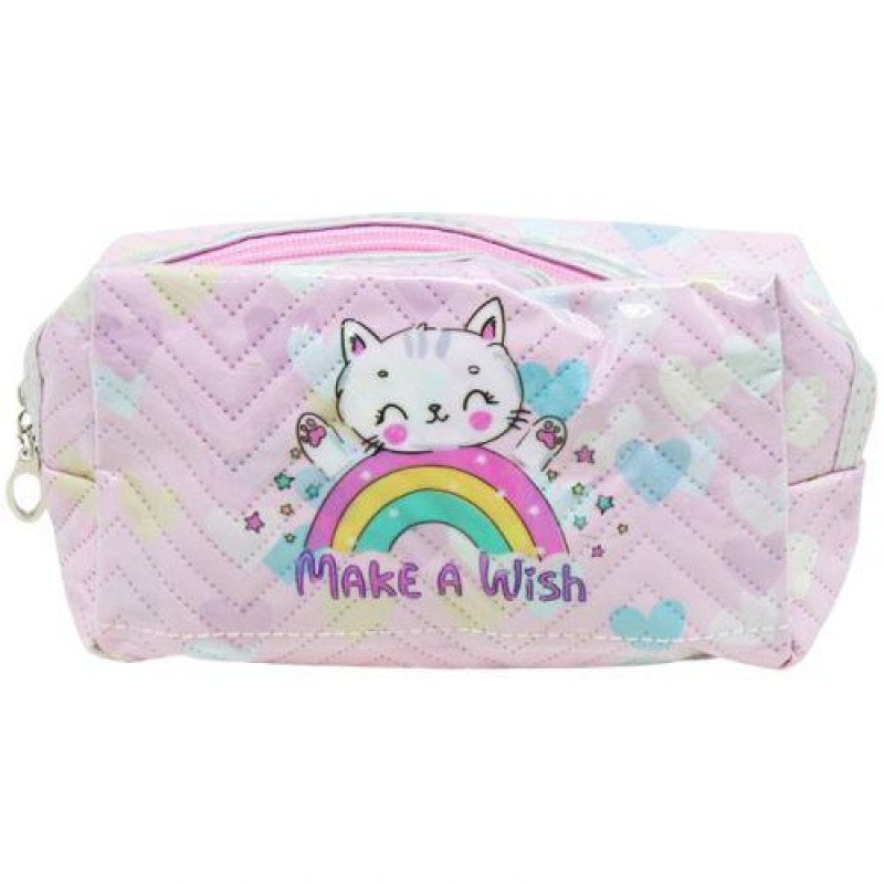 Компактний пенал-косметичка в оригінальному дизайні. Пенал виконаний з міцного та приємного на дотик матеріалу. Передня частина пеналу прикрашена яскравим малюнком із котиком на веселці. Є одне відділення, яке закривається на блискавку. Міцні матеріали та надійна фурнітура. Розмір: 25 х 10.5 х 3 см. Різні кольори в асортименті.
