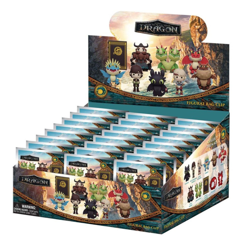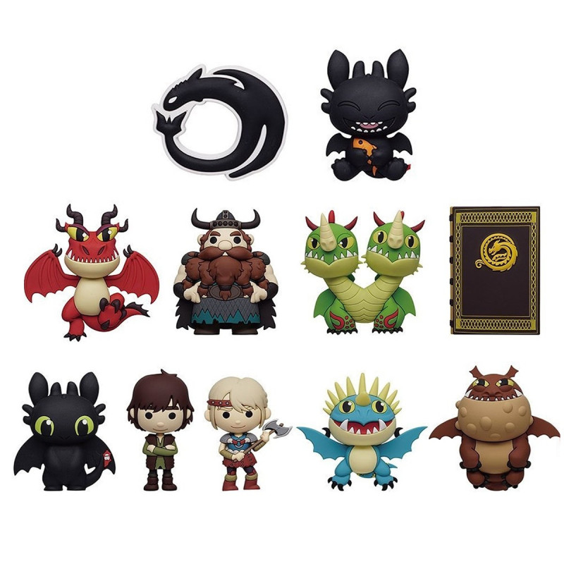 В асортименті 11 головних героїв, з яких 2 рідкісних: Беззубик, Гикавка, Астрид, Гумгільда, Сарделька, Кривоклик, Стоїк, Барс і Вепр, Книга драконів, Логотип з драконом (рідкий) і Мілий Беззубик (рідкий).