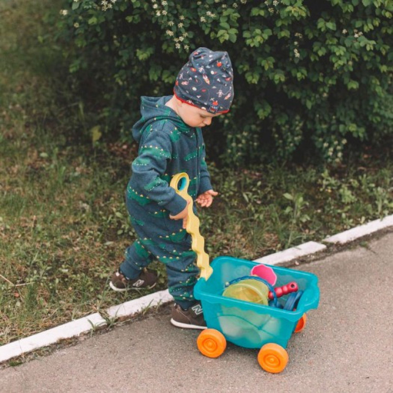 Симпатичний візок з чудернацькою ручкою включає корисні аксесуари для гри в пісочниці і на пляжі: