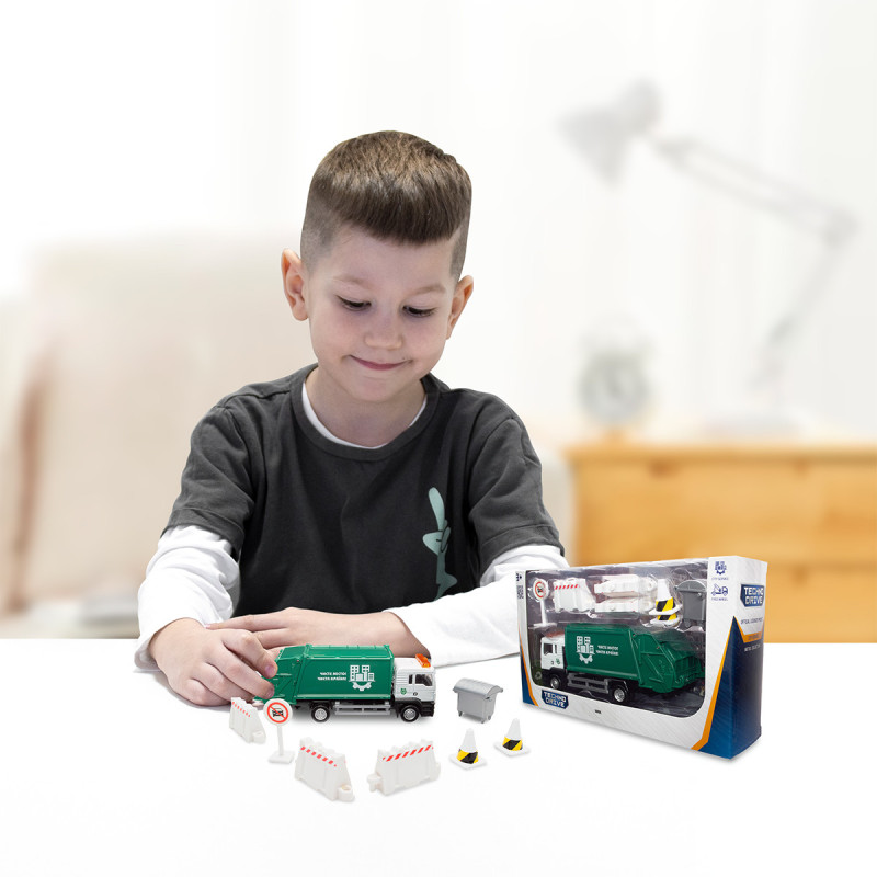 Модель підійде для різних захоплюючих сюжетів, з її допомогою дитина зможе пофантазувати і весело провести час. А завдяки дорожнім знакам і контейнеру для сміття в наборі, гра стане ще цікавішою!