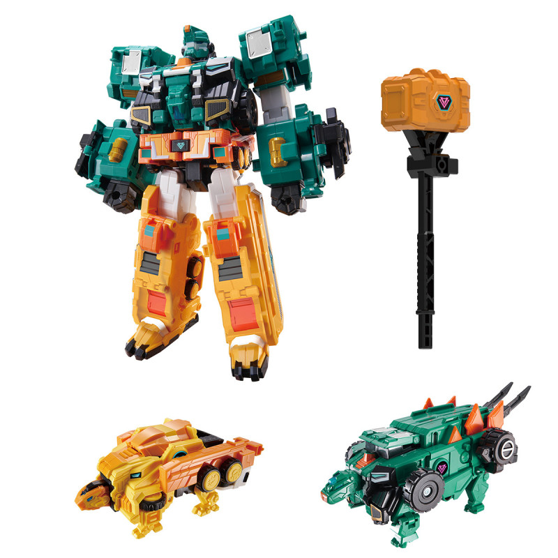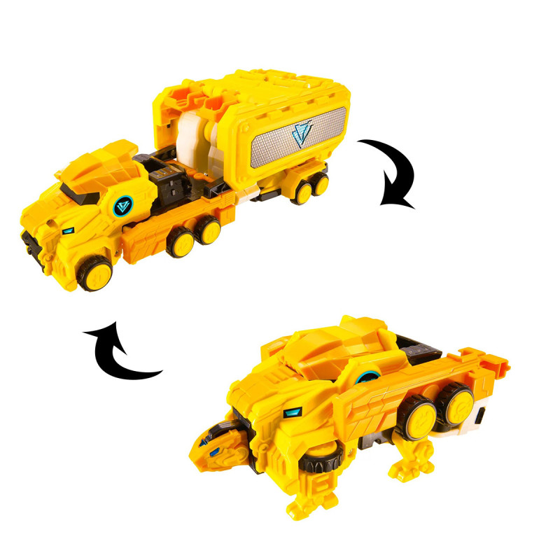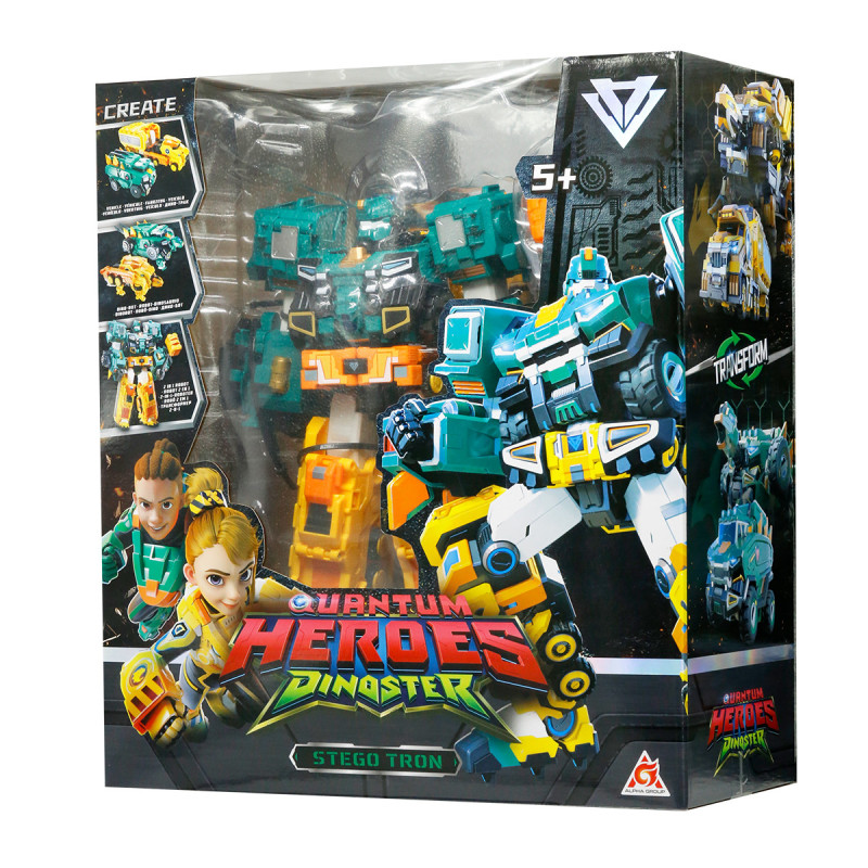 У комплект входить - 1 робот, який трансформується в 2 машини і 2 динозаври, аксесуари, аркуш з наклейками, інструкція;