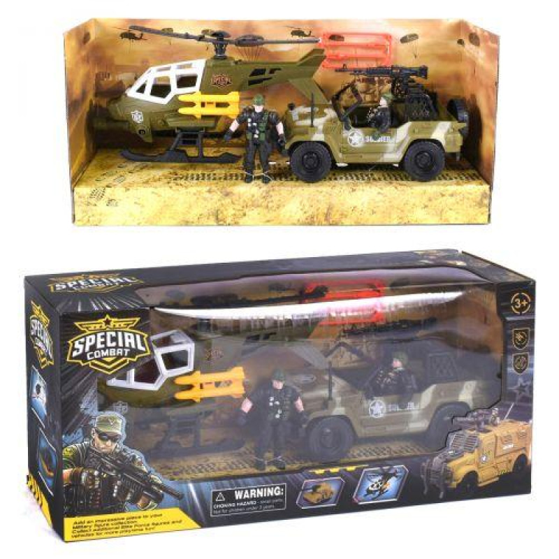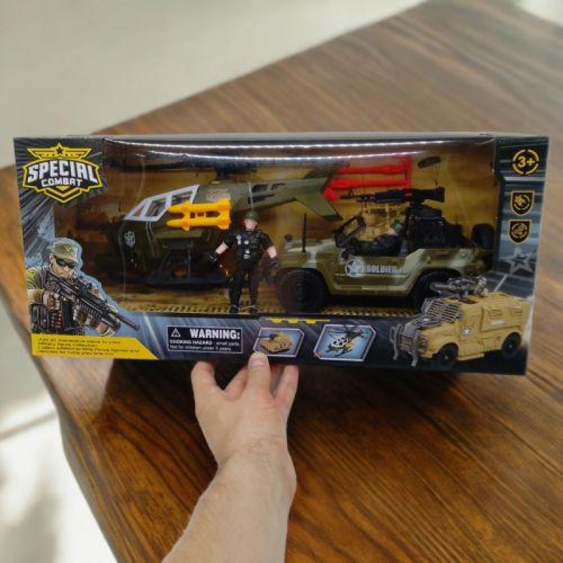 Набір військової техніки. У комплект входять джип з кулеметом, вертоліт, 2 солдати та 2 ракети. У гелікоптері є запускник, за допомогою якого можна стріляти ракетами, натиснувши кнопку. У вертольота також обертається гвинт. За допомогою набору можна побудувати військову сцену чи просто весело грати. Все зроблено із високоякісного пластику.