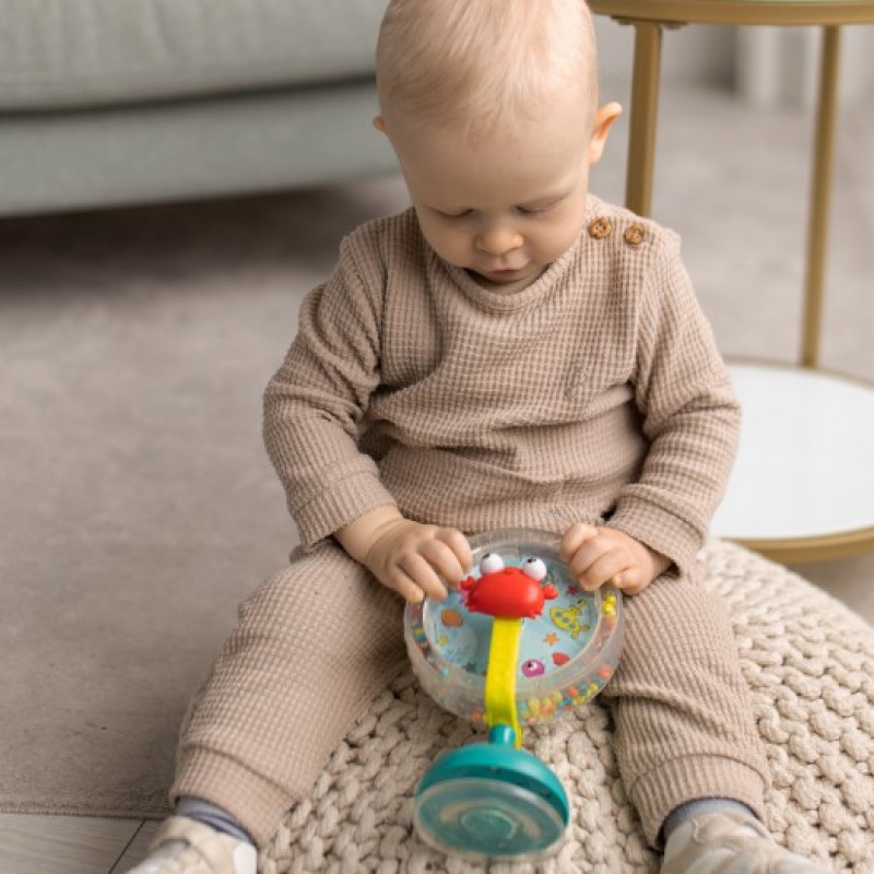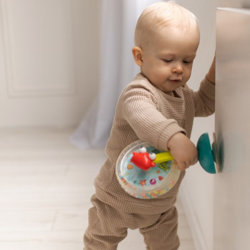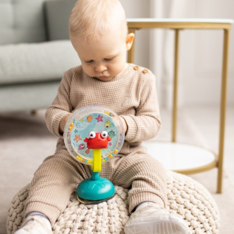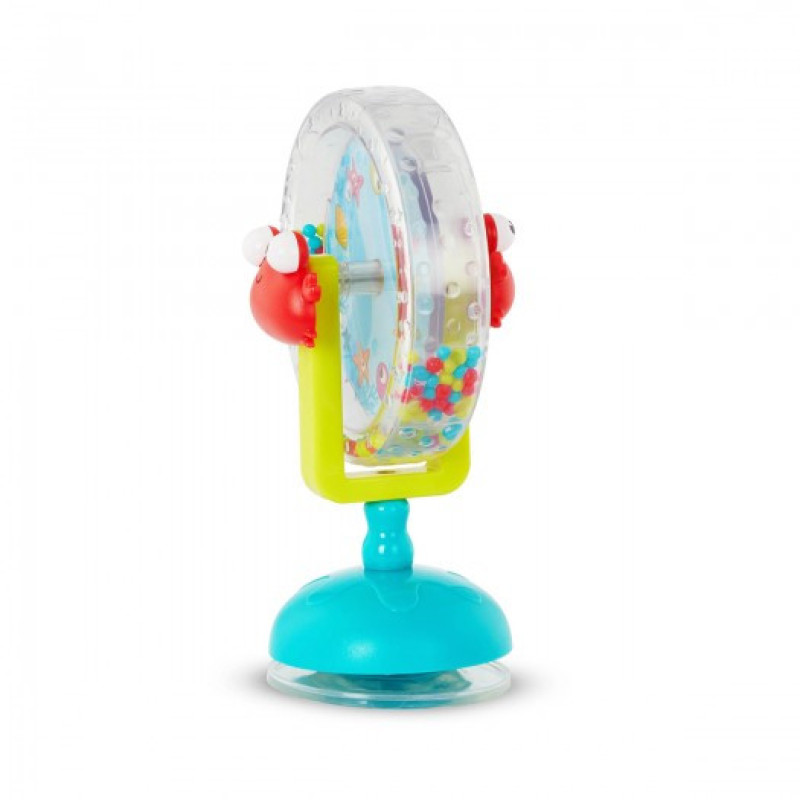 - На ніжці іграшки є присоска: її можна легко прикріпити до рівної поверхні, щоб малюку було зручніше крутити колесо. Ідеально підходить для столу або дитячого стільця.