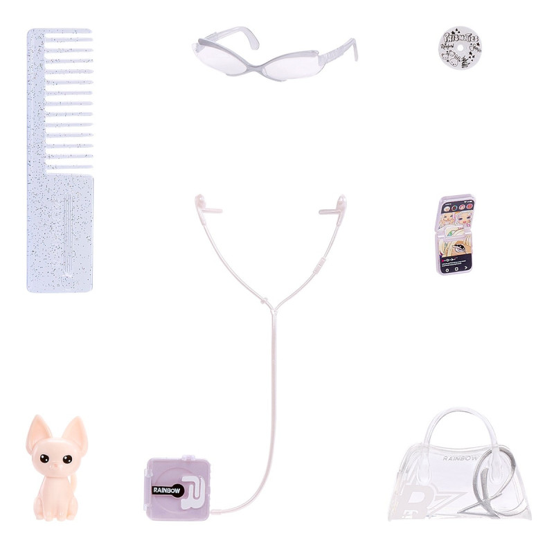 До комплекту входить — 1 лялька, 1 куртка, 1 боді, 1 спідниця, 1 пара взуття, 1 пара окулярів, 1 сумочка, 1 фігурка кота, 1 іграшковий;