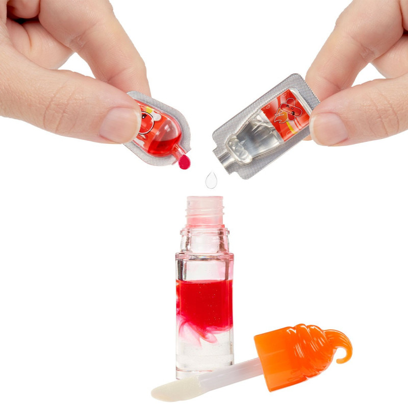 • Створіть сяючий блиск для губ! Поєднайте рідини з блістера ароматизатора та блістера з рідким барвником у пляшечці блиску для губ. Перемішайте його ложкою для перемішування, закрийте та потрусіть, щоб відкрити свій власний блиск для губ!