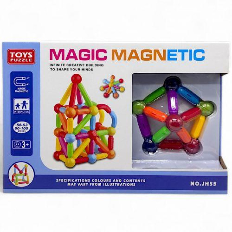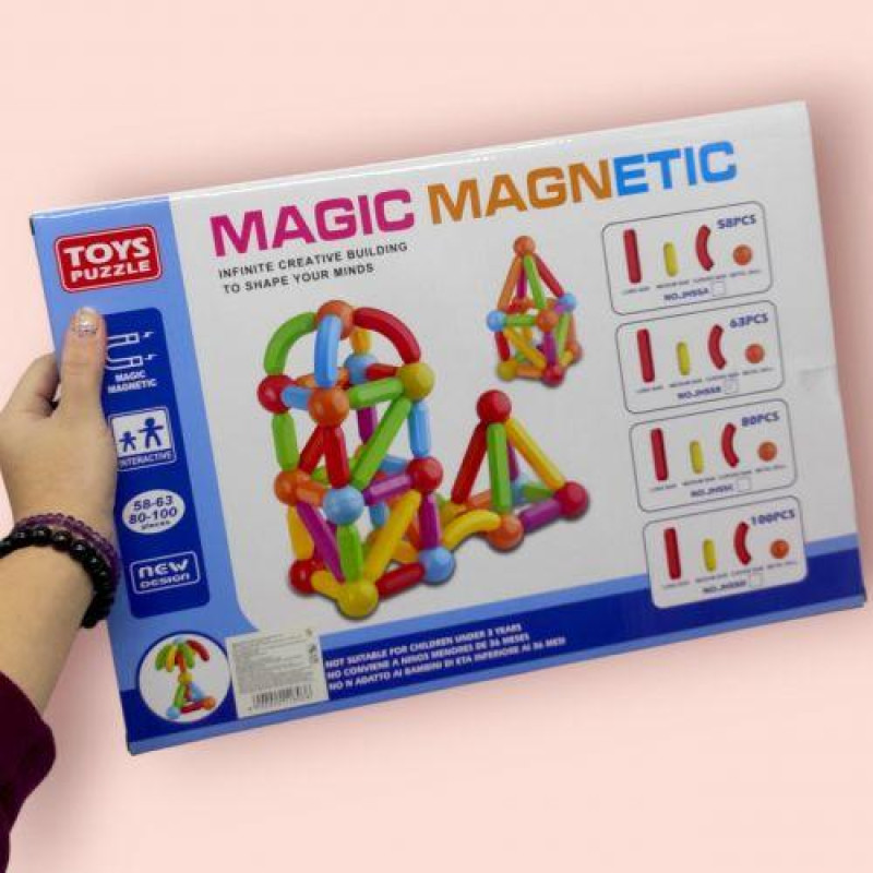 Цей магнітний конструктор - чудова іграшка для розвитку творчих здібностей дітей. Завдяки вбудованим магнітам елементи легко збираються і тримаються разом, тому будувати великі споруди, такі як вежі, дуже просто. У набір входять 4 типи будівельних блоків - довга паличка, коротка паличка, вигнута паличка і металева кулька (яку можна використовувати для з'єднання декількох різних паличок). У комплекті також є брошура з декількома готовими конструкціями, які ваша дитина може зібрати самостійно.