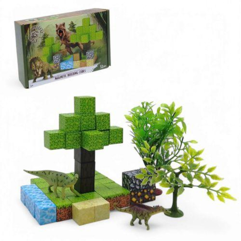 - Магнітні блоки стилізовані під текстури Minecraft. Розмір кубика - 2 см.- 2 фігурки динозаврів, які додадуть грі захопливий елемент пригод.- 2 декоративних дерева для створення унікальних ландшафтів та сцен.