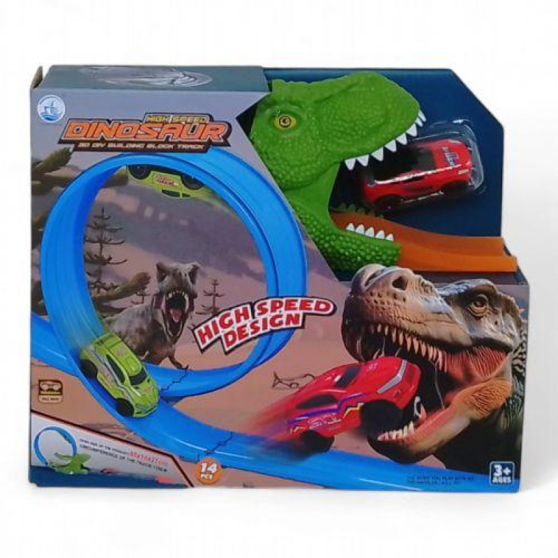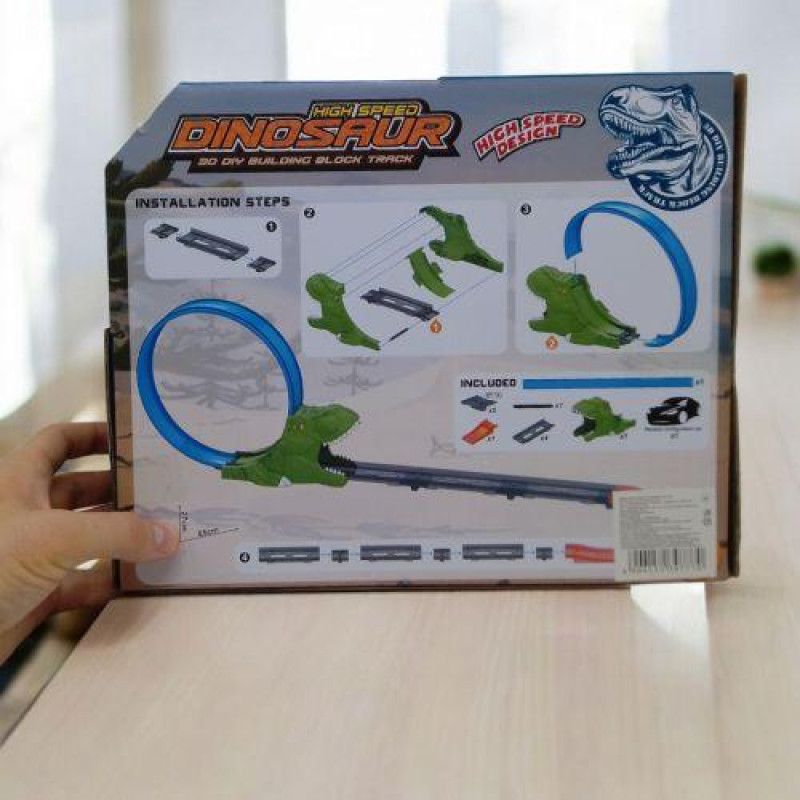 Дитячий трек із інерційною машинкою. Машина розганяється, на великій швидкості входить у пащу динозавра, робить запаморочливі перевороти в петлі та вилітає з треку. Машинка пластикова. Трек складається із 14 елементів. Розмір у зібраному вигляді – 85 х 10 х 27 см.