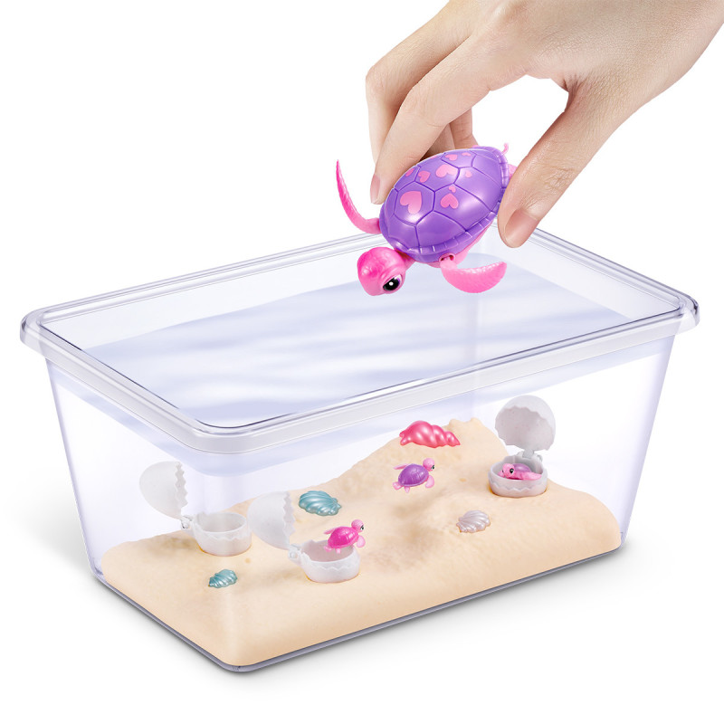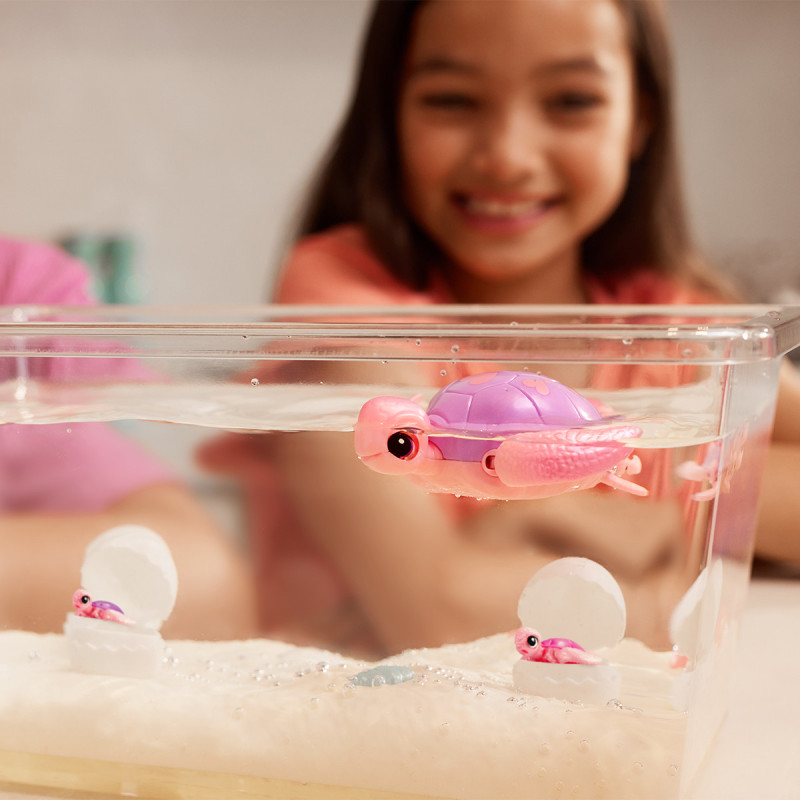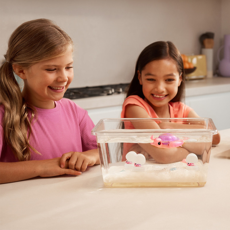 Пограйте з мамою-черепахою та її малюками! У «пісочній» основі сховалися три яйця – налийте воду в акваріум, і вони самі відкриються! Скільки маленьких черепах з'явиться цього разу? Прикріпіть їх до мами – і разом вирушайте у водну пригоду!