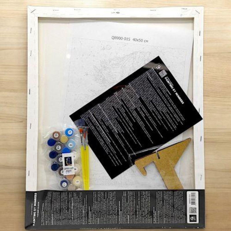 Комплектація: полотно на підрамнику з галерейною натяжкою, художні нейлонові пензлі, палітра акрилових фарб у контейнерах, дерев'яні деталі підставки для картини.