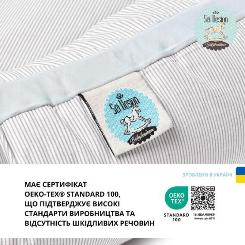 Натуральна бавовна та антиалергенний наповнювач гарантують, що кокон безпечний для дитячої шкіри. Сертифікат Oeko Tex підтверджує відсутність шкідливих речовин.