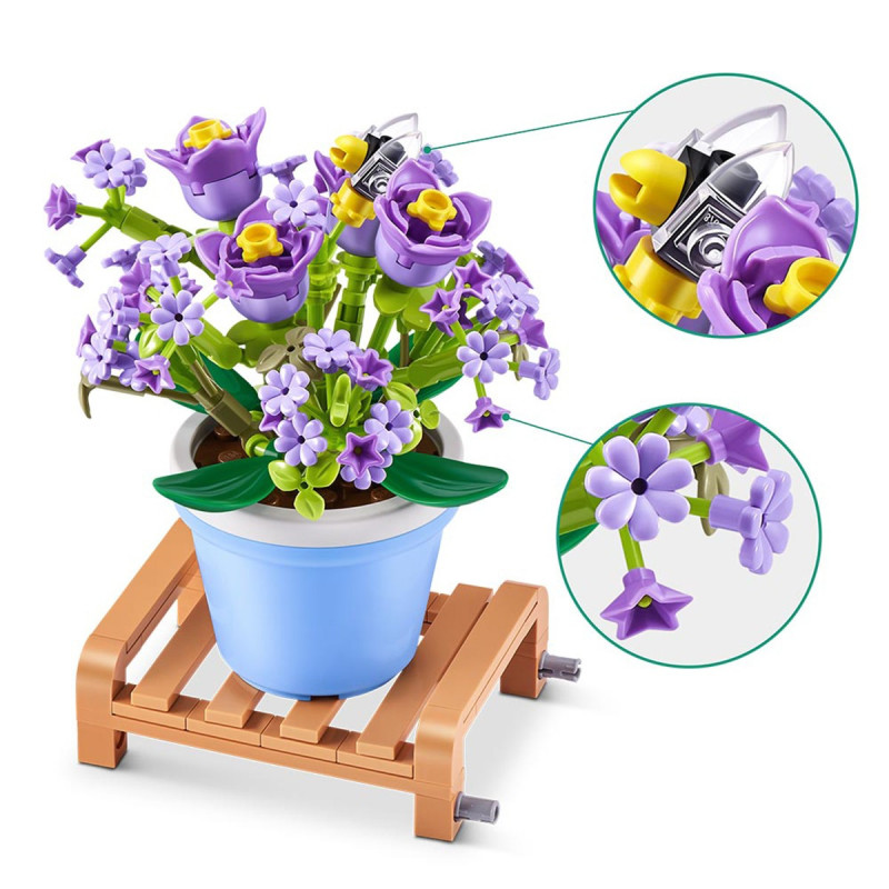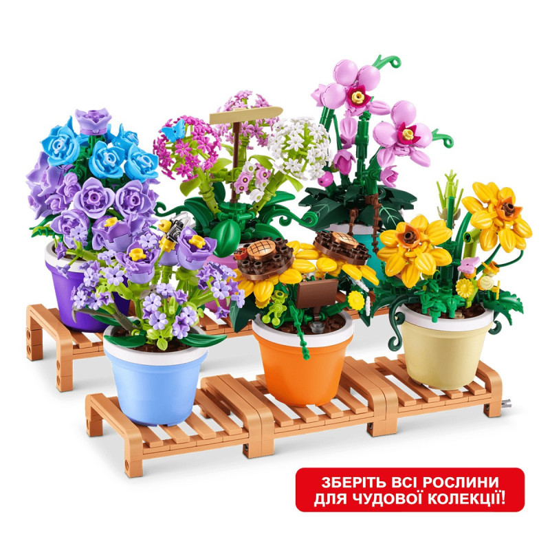 - 6 різних рослин у серії: гортензія (233 деталі), соняшник (151 деталь), гіпсофіла (192 деталі), дзвіночки (186 деталей), космея (152 деталі) та місячна орхідея (169 деталей).