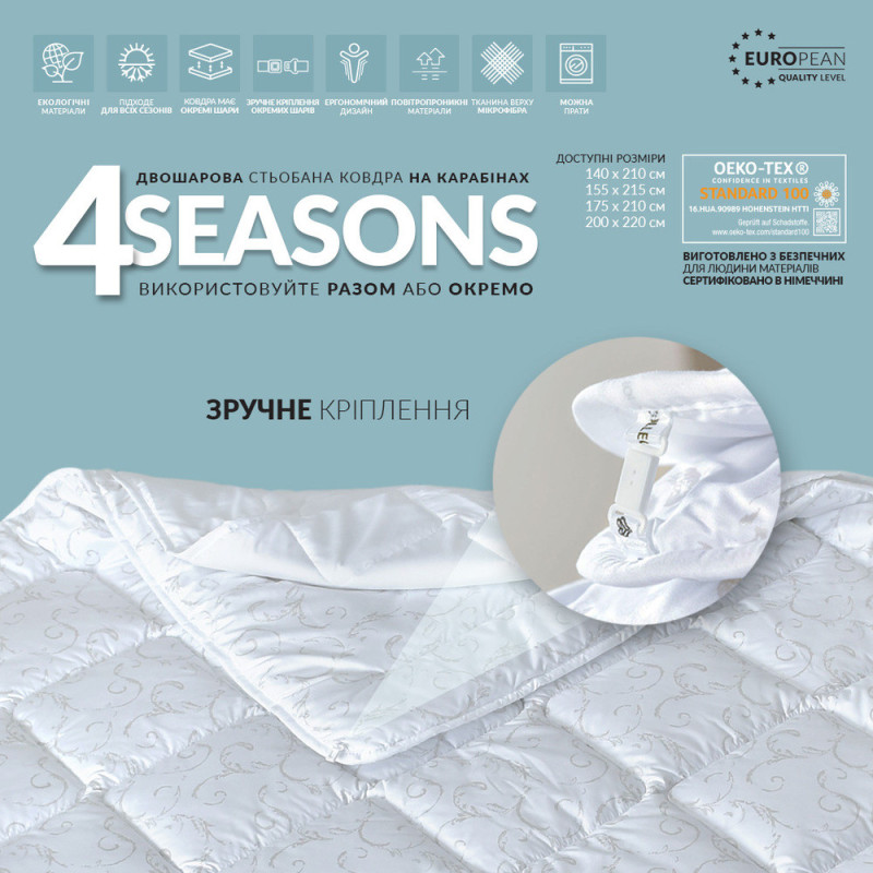 Універсальну антиалергенну всесезонну ковдру можна використовувати цілий рік. Тепла зимова та літня ковдри скріплюються між собою за допомогою карабінів по кутах. Спеціальна технологія стьобання на спеціальному обладнанні підвищує якісні характеристики виробу. Ексклюзивне художнє стьобання додає ковдрі презентабельності. М'яка і приємна на дотик тканина простьобана разом з наповнювачем. Щільність тканини покращує зносостійкі характеристики ковдри. Наповнювач з екологічно безпечного матеріалу добре пропускає повітря і зберігає форму, не створює умов для розвитку грибків і кліщів.
