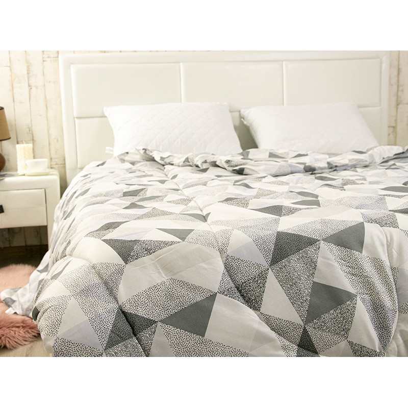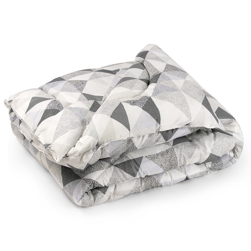Демісезонна, стебнована ковдра Абстракція виконана в дизайнерському колірному рішенні. З одного боку геометричний малюнок з іншого - однотонна тканина. Спокійні і стримані кольори ковдри, будуть гармонійно виглядати в будь-якому інтер'єрі спальні. Якісне стебнування надійно тримає наповнювач всередині ковдри, зберігаючи його пишність і прекрасну теплоту навіть після прання. Наповнювач добре тримає форму, не скачується всередині і не деформується з часом.