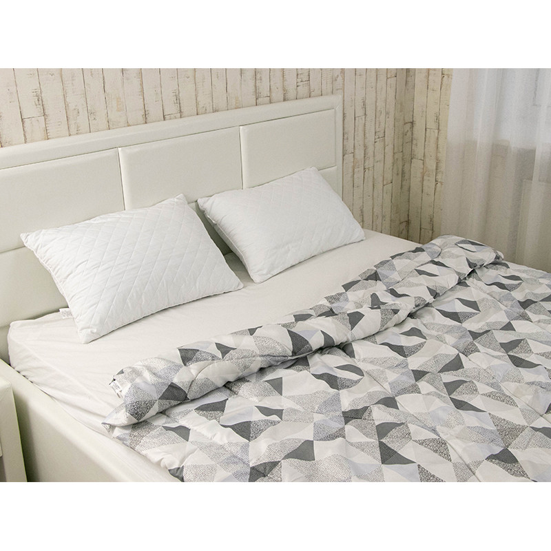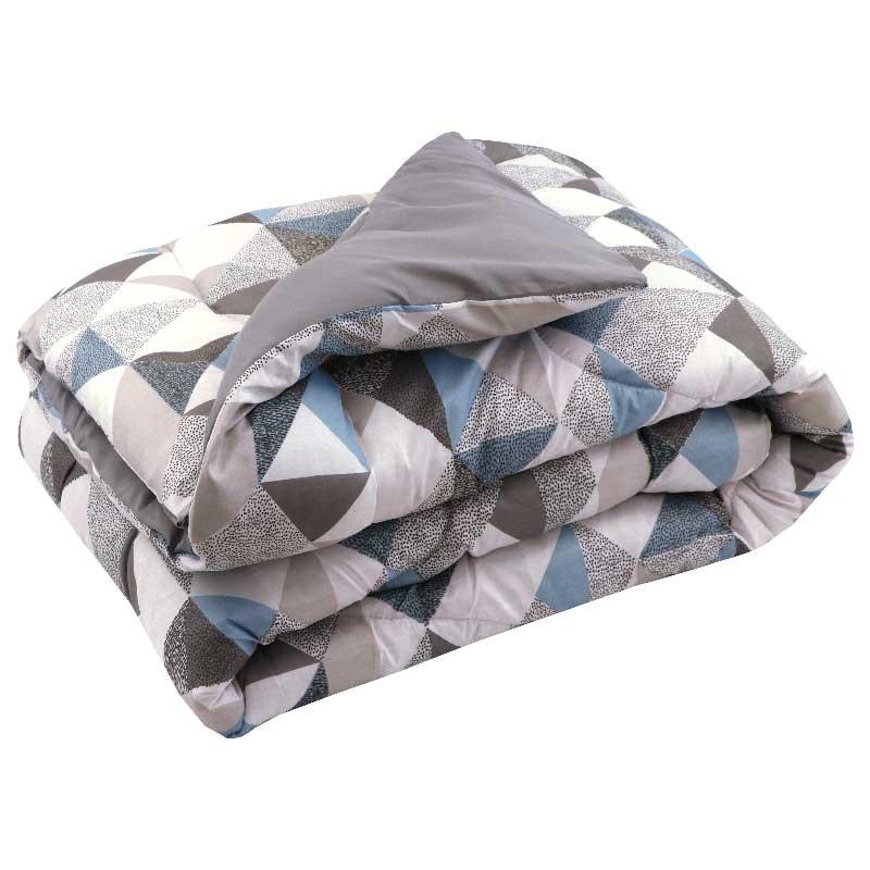 Демісезонна, стебнована ковдра Абстракція виконана в дизайнерському колірному рішенні. З одного боку геометричний малюнок з іншого - однотонна тканина. Спокійні і стримані кольори ковдри, будуть гармонійно виглядати в будь-якому інтер'єрі спальні. Якісне стебнування надійно тримає наповнювач всередині ковдри, зберігаючи його пишність і прекрасну теплоту навіть після прання. Наповнювач добре тримає форму, не скачується всередині і не деформується з часом.