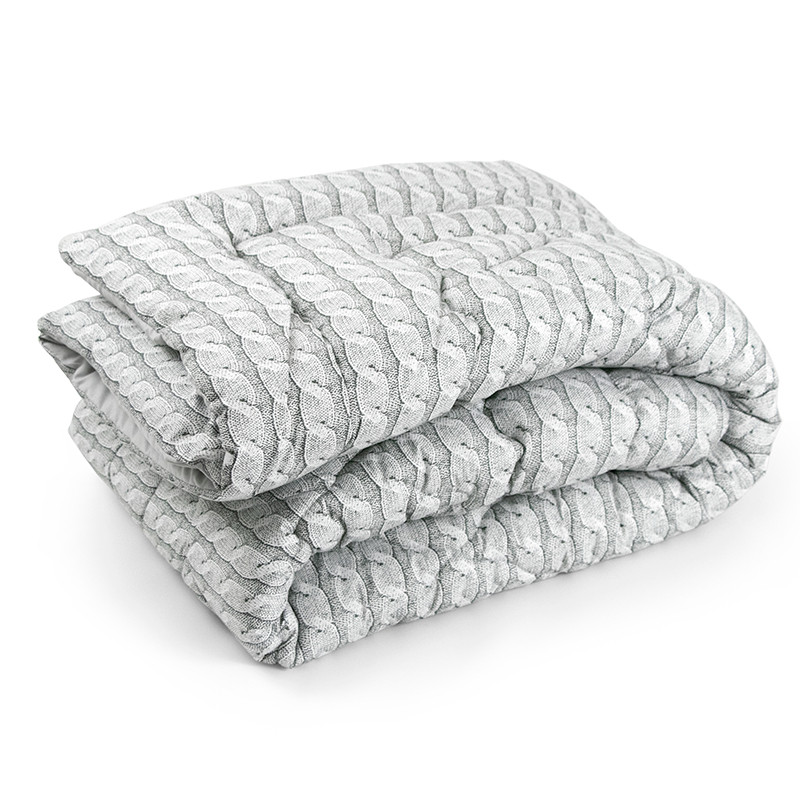 Дизайн виробу, незвичайний, один бік з нанесенням малюнка під в'язку техніка кіска, додасть родзинку в інтер'єр вашої спальні, таку ковдру не хочеться ховати в підковдру, але щоб доглядати за чистотою ковдри було легше, ми розробили постільні комплекти Grey Braid з таким же малюнком. Доповнити ковдру також можна подушками для сну, покривалом і декоративними подушками колекції Grey Braid. Принт виконаний у сірих відтінках, з імітацією в'язаного полотна дуже затишний.