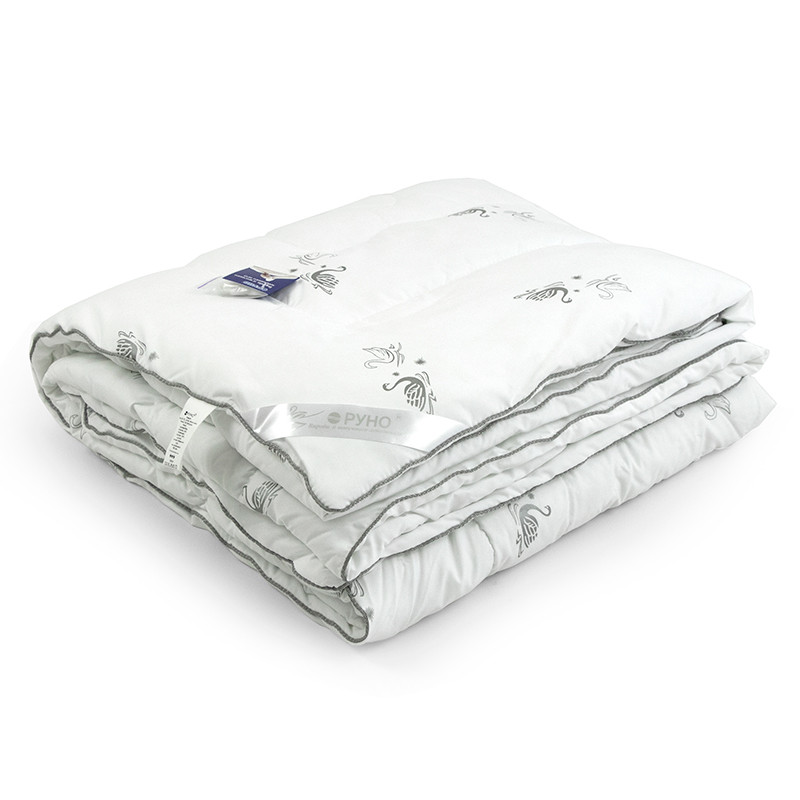 Ковдра зі штучного пуху «Silver Swan demi» ТМ Руно - надзвичайно легка, повітряна, м'яка і приємна на дотик, легко відновлює і зберігає свою форму при тривалій експлуатації і пранні. Чохол ковдри простьобан фігурним стебнуванням в поєднанні з сірим кантом виглядає просто розкішно. Ковдра є в трьох розмірах 140/205, 172/205см, 200/220 см.