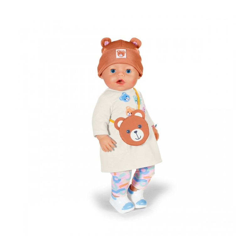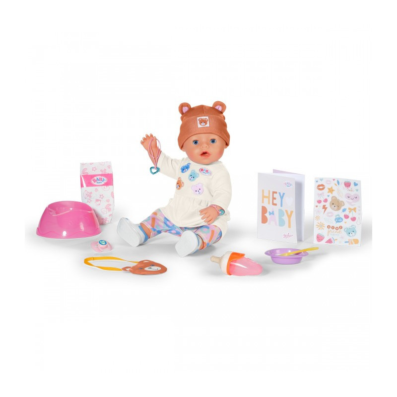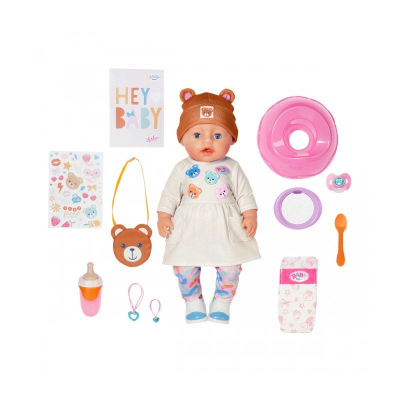 1 кукла, комплект одежды, тарелочка с ложкой, подгузник, сумочка, пустышка, горшок, бутылочка, брасл