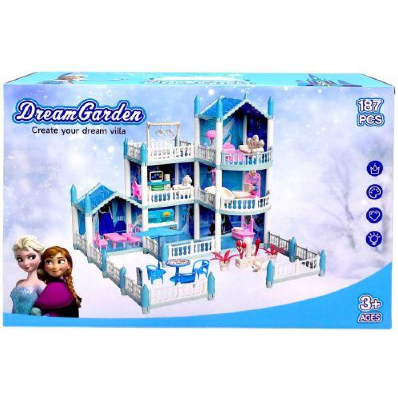 Ляльковий будиночок за мотивами популярного мультфільму "Крижане Серце". Комплект складається з багатьох деталей для побудови будиночку, його інтер'єру та екстер'єру, щоб динима могла більше поглибитись у гру. Виконаний з якісних та міцних матеріалів, буде чудовим подарунком дитині. Рекомендовано для діток від 3 років.