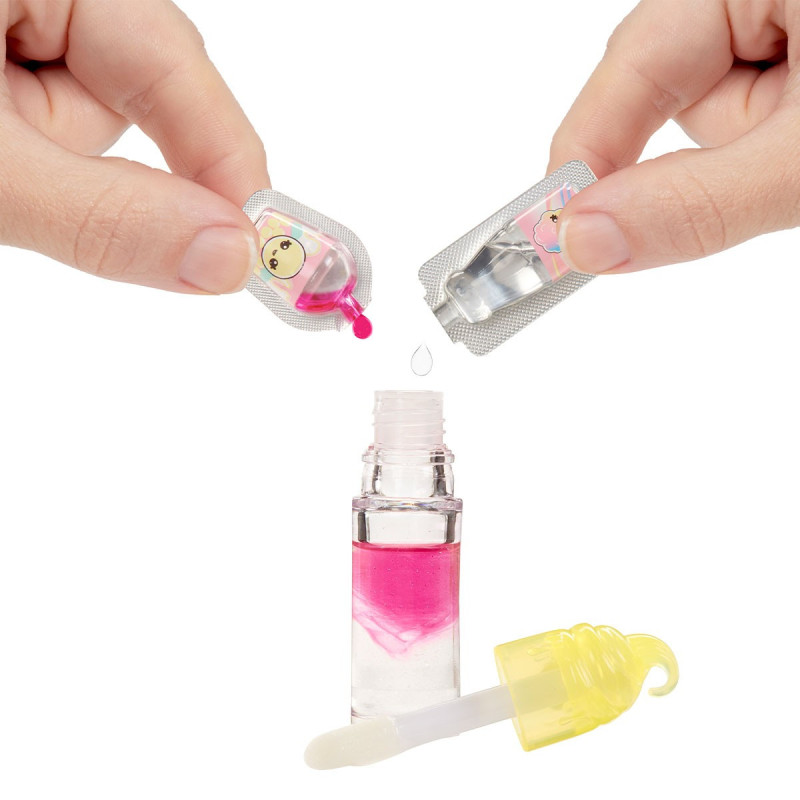 В комплект входить:1 кукла, 1 комплект одежды, 1 пара обуви, 1 бутылочка блеска для губ, 1 клипса, 1 блистер ароматизатора, 1 блистер жидкого красителя, 1 ложка для перемешивания, 1 контейнер, инструкция