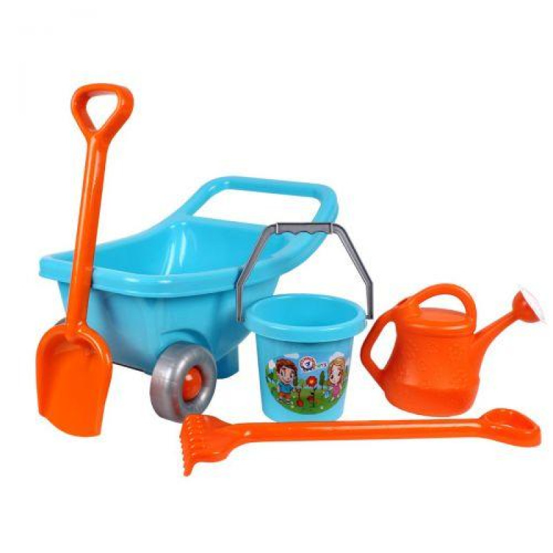 Ігровий набір з тачкою. У комплекті з тачанкою є пісочний набір - граблі, лопатка (50 см.) І леечка і відерце. Виконано набір з якісного пластику. Для дітей від 3-х років.