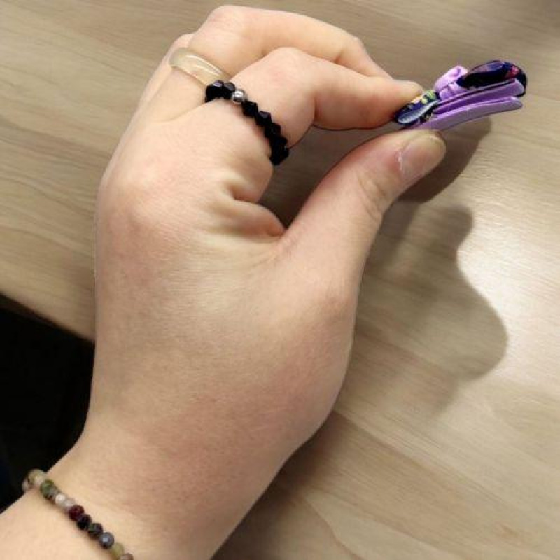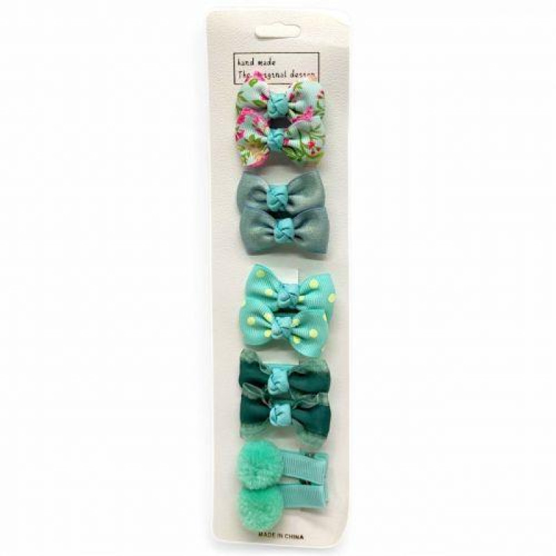 Набір милих прикрас для волосся (заколочок) у вигляді бантиків. Такі бантики чудово доповнять образ юної принцеси. Кожна заколочка має металевий каркас та текстильну обшивку. Тип кріплення: "крокодильчик". У комплекті є 5 пар бантиків. Розміщені на картонному аркуші.