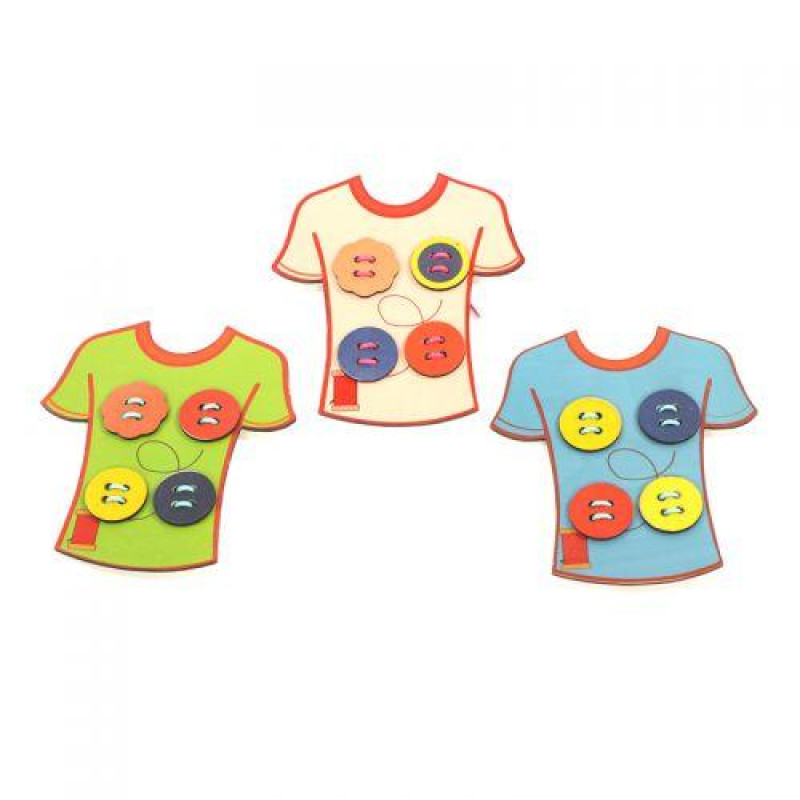 Набір "Футболка" складається з пласкої дерев'яної основи та чотирьох гудзиків, які кріпляться до основи за допомогою шнурків. Дитина навчиться різним способам кріплення гудзиків та різним вузлам. Розвивається дрібна моторика рук. Розмір іграшки – 18х16 см.