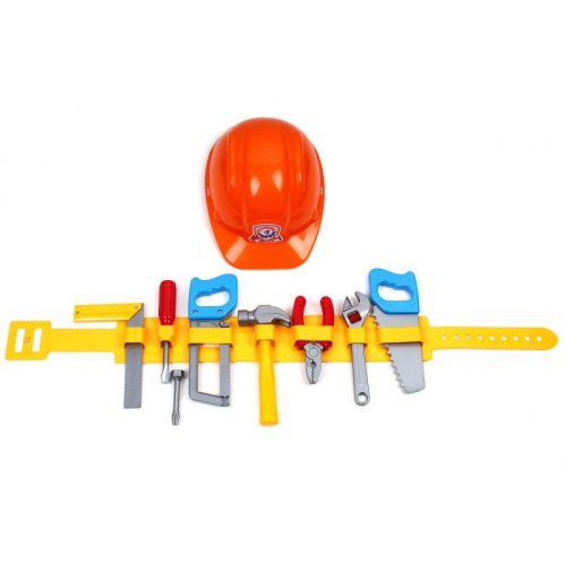 Комплектація: Каска, пояс, плоскогубці, пила по металу і пила по дереву, куточок, молоток, розвідний ключ, викрутка з двома насадками