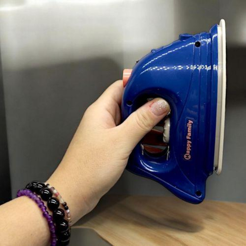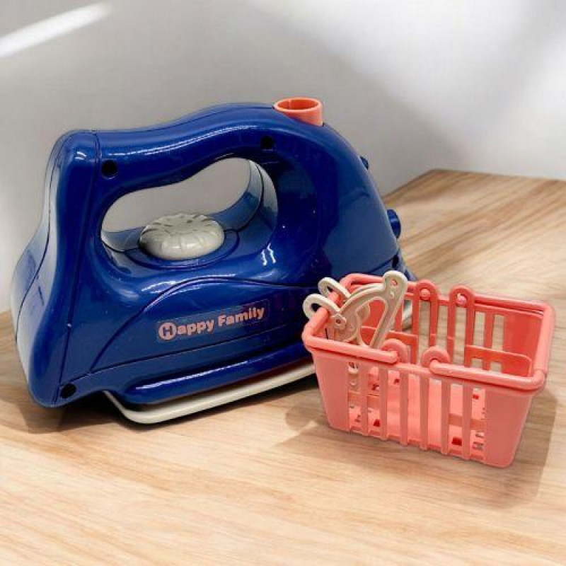Дитяча праска "Happy Family". Працює від 2-х батарейок АА (немає в комплекті). Знизу на прасці розташована кнопочка, при натисканні якої іграшка починає вібрувати. Таким чином, вібрацію можна відчути в процесі прасування, якщо притиснути праску до одягу. Також оснащений спреєм. Щоб його використати, потрібно заповнити резервуар усередині праски водою. Розмір іграшки: 16х17х7 см.