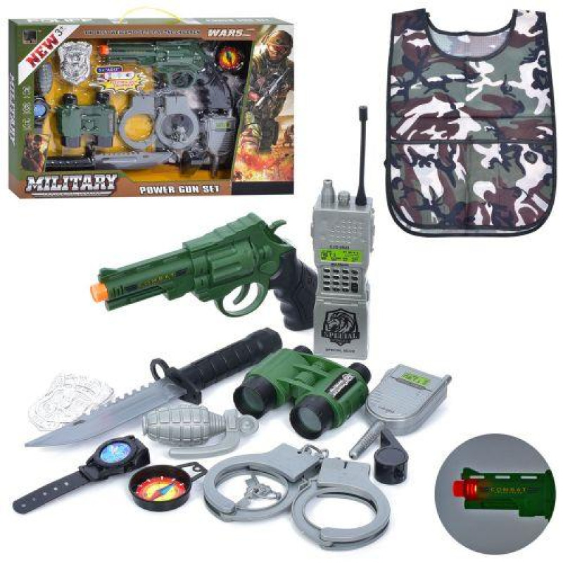 Комплектація: Пістолет, наручники, бінокль, жетон, свисток, компас, ніж, 2 рації, граната, годинник