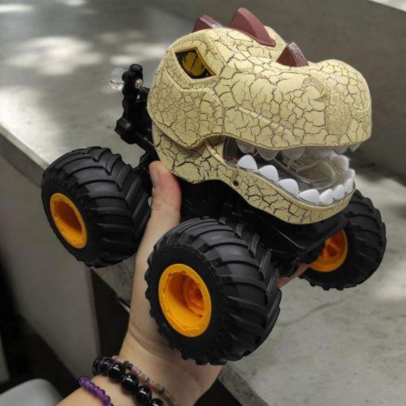 Позашляховик на радіокеруванні виконаний у вигляді голови динозавра. Має великі гумові колеса, які забезпечують хорошу прохідність майже по будь-якій поверхні. Їздить уперед і назад, повертає ліворуч та праворуч. Оснащений парогенератором, який імітує дим із пащі динозавра. Також у машини світиться корпус. Розмір машинки - 17х16,5х15 см., діаметр коліс - 7 см. Працює від акумулятора (є в комплекті), пульт від 2-х батарейок АА (немає в комплекті).