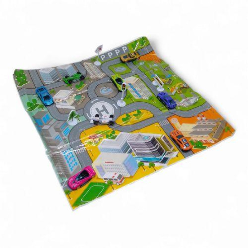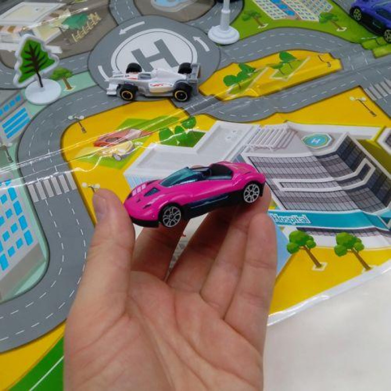 Ігровий набір з металопластиковими моделями легкових машинок, клейончатим килимком з зображенням міських доріг та локацій, а також декорацій (дорожні знаки, дерева і т.д). Машинка виготовлена з якісного пластику та металу, декорації повністю пластикові. Розмір машинки - 7х3х1,5 см., розмір килимка - 50х50 см. Різні види наборів в асортименті.