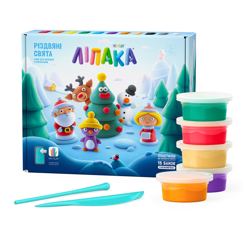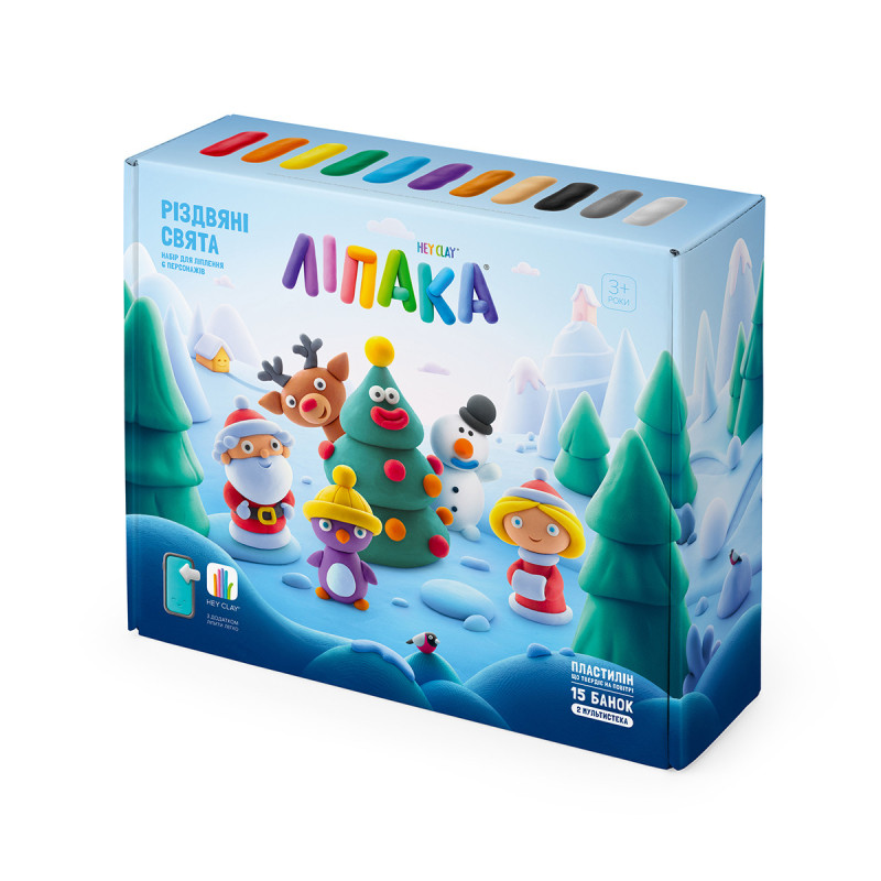 Меганабір самозатвердіючого пластиліну ЛИПАКА – РІЗДВЯНІ СВЯТА – розважить і дітей та дорослих. За допомогою анімаційних інструкцій у додатку HEY CLAY, Ви зможете зліпити 6 унікальних персонажів: Святого Миколая, Меланку, Пінгвіненка, Ялинку, Оленя та Сніговика. Пластилін твердне на повітрі за 24 години, після чого можна грати створеними фігурками.